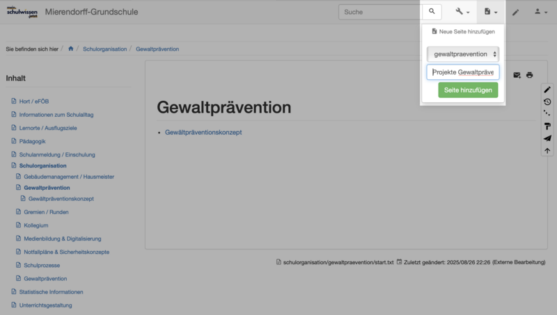 3. Überlegt euch einen passenden Titel für euren neuen Artikel, z. B. „Projekte Gewaltpräventation“ und klickt auf „Seite hinzufügen“